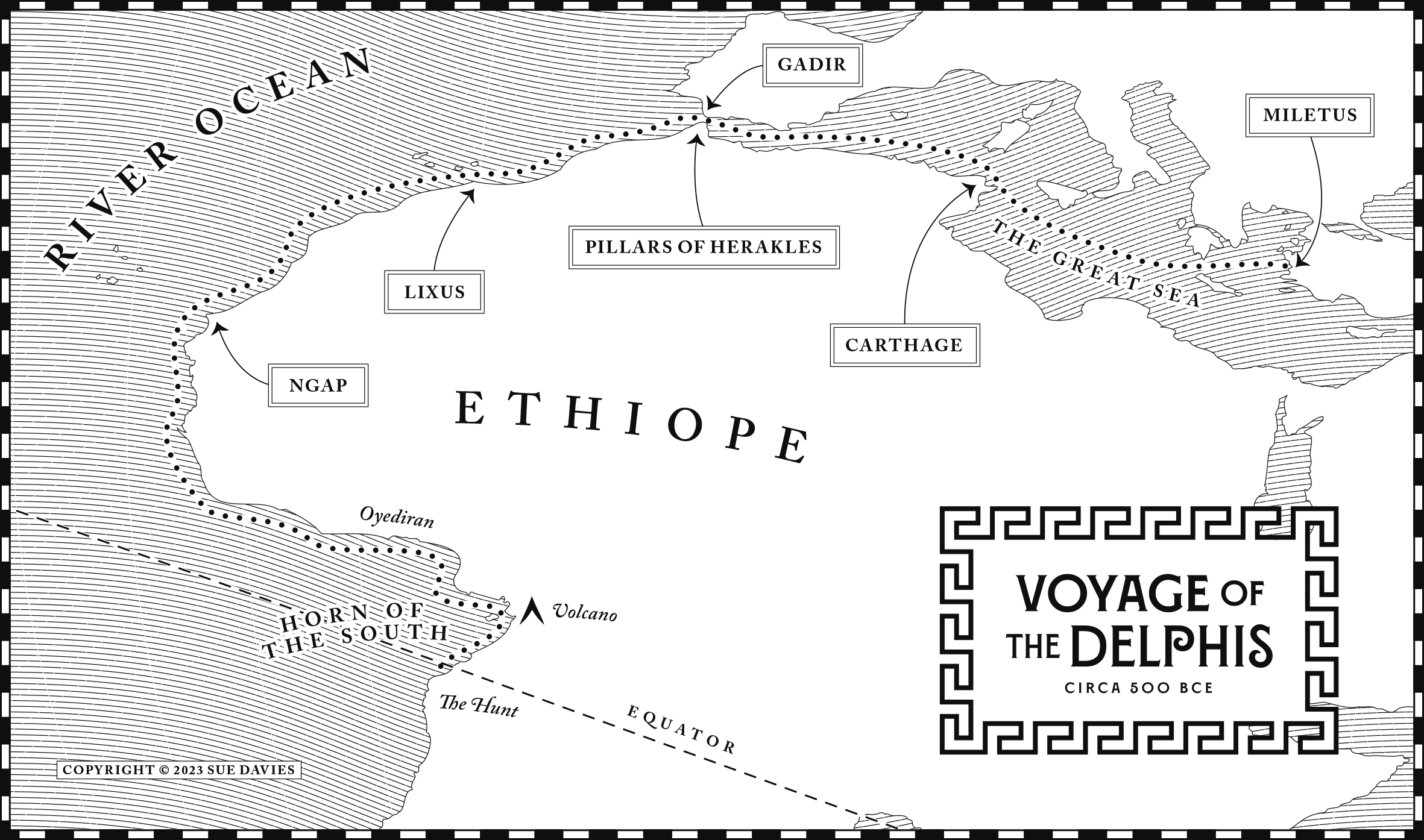 As though to pray, he kneels beside the tiller platform and hunches forward to lay this star map on top of the rest. The records lie one below the other in a pile, displaying how the stars looked in the sky above The Delphis at every different stage of their journey since they first set out. The bottom one, of what might be six seasons ago, is the night they left the strait behind and Melqart was overhead as usual. He runs his finger down the edge of the pile and stops at one where the skin juts out. He raises the rest, heavy on his wrist, and peers at it. This time, Orion is a quarter of the way across, at the place where Hanno became commander and things began to go wrong. He flicks fast through the others. There’s a series of blanks, which are relentless in their emptiness. This is the part of the journey where the clouds lay thick above all day and all night, where the night sky vanished and no stars could be seen. This is where the lightning began. His mind goes heavy with memory and fear. And here, with wet splodges at the bottom, is where Nyptan…. His thoughts freeze and the frown on his brow deepens as his heart races off on its own. He flaps a hand across his face. Stop looking at them, he thinks. Stop dwelling on it. He pulls his hands away and lets them all slap back into place. With his teeth clenched and mouth in a straight line, he uses both palms to smooth the top one down. He puts his thumbs at the bottom of the pile and starts to shove them all into a large roll. They overlap each other, curl in like seashells, and he lifts and juggles them under an arm while his other hand searches for the leather cylinder at his side. These are his written records, his evidence for his master, Hekataios of Miletus, of his journey with Hanno, the Carthaginian, beyond the Pillars of Herakles. He promised he would make records of everything he saw in the sky above and sea below and, blank as some are, smudged or imperfect the rest, these are them, his, the navigator’s account of every day that’s passed, or night sky observed, since the expedition began.